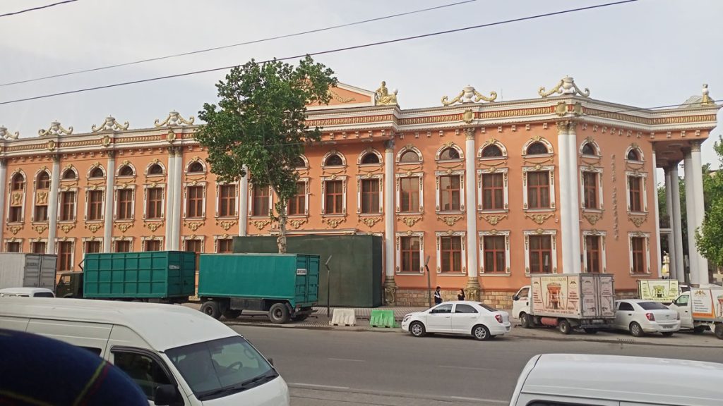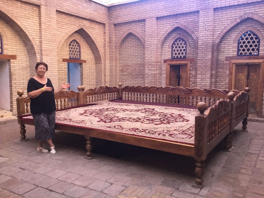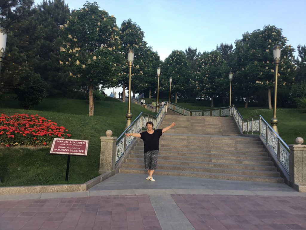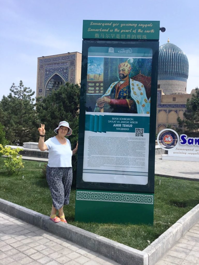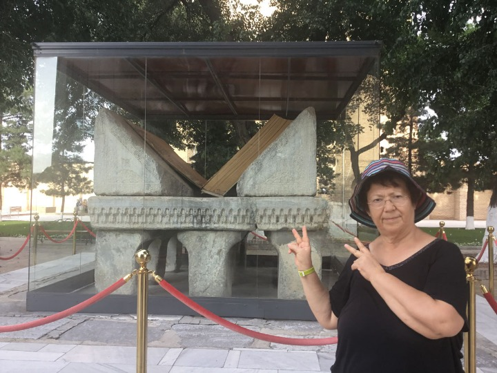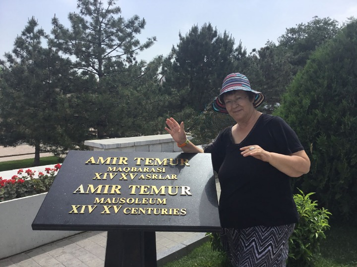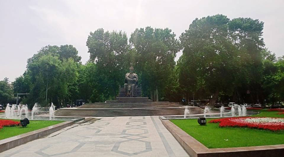 Amir Temur, Üzbekistan’da ulusal bir kahraman olarak kabul edilir. Amir Temur’un heykelinden daha büyük olan bu oturma alanı etrafta yoğun trafik olduğu için durmadan geçiyoruz. Otobüsten çekebildiğimiz fotoğraftaki Timur heykeli Özbekistan’daki üç Timur heykelinden birisi: Timur’un binicilik heykeli Taşkent’te, ayakta duran heykeli ise Shahrisabz şehrindeymiş.