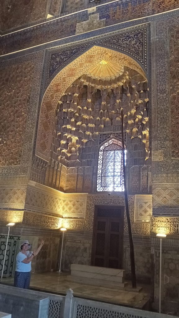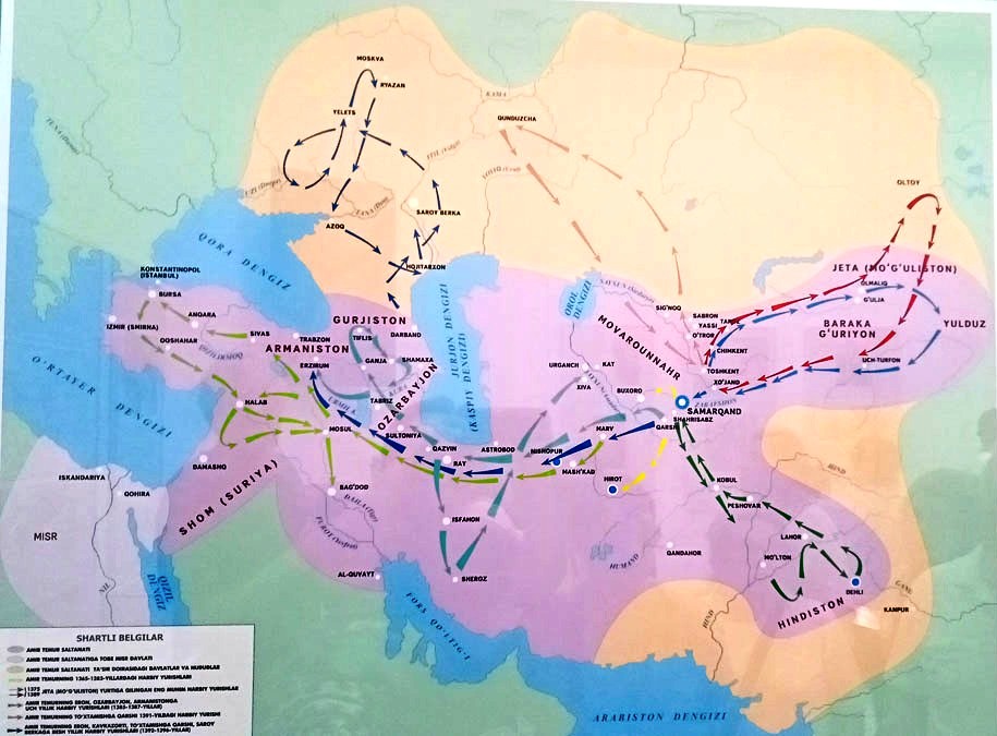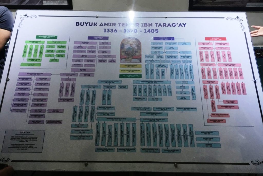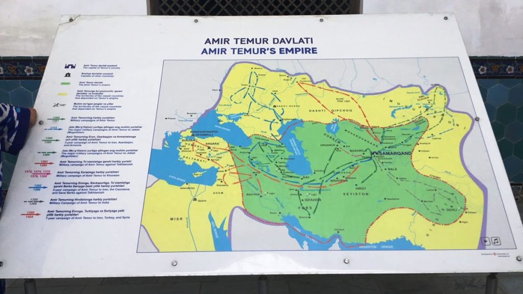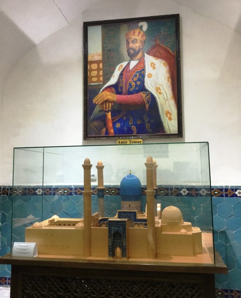 Mezarların bulunduğu salona giderken önce Timur’un resmi ve fethettiği toprakların haritasını görüyoruz. Amir Timur’un hakimiyetindeki toprakların ne kadar geniş bir alanı kapsadığı açıkça görülüyor.