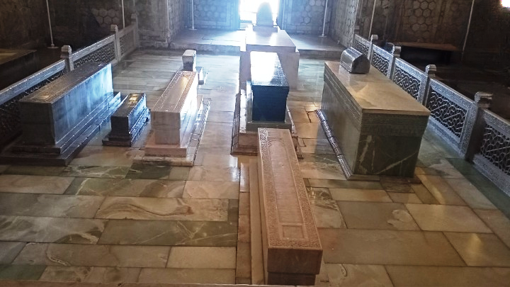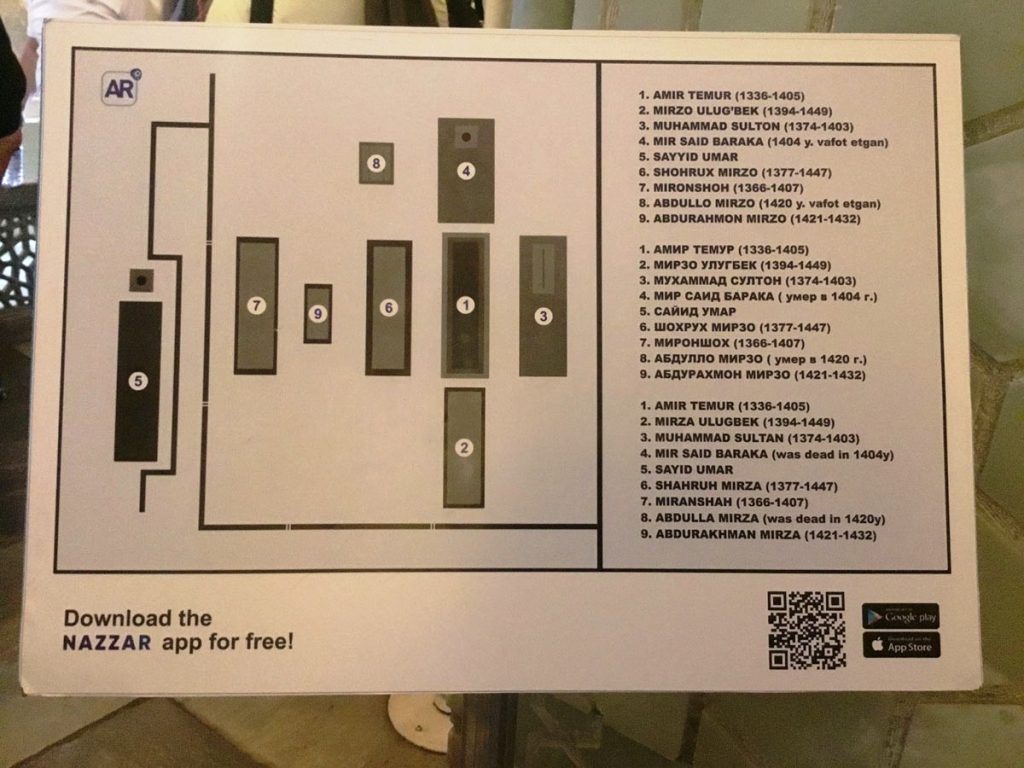 Ortada bulunan koyu yeşil yeşim taşından tek bir blok halinde olan mezar Timur’a aittir. Solunda ki sade mermer mezar taşı Uluğ Bey’e sağında ki ise Timur’un manevi danışmanlarından Mir Sais Baraka’ya, önündeki taş Muhammed Sultan’a arkasındaki taşlar ise oğulları Şahruh (Uluğ Bey’in babası) ve Miran Şah’a aittir. Bunların arkasında ise Timur’un hocalarından Şeyh Said Ömer yatmaktadır.
