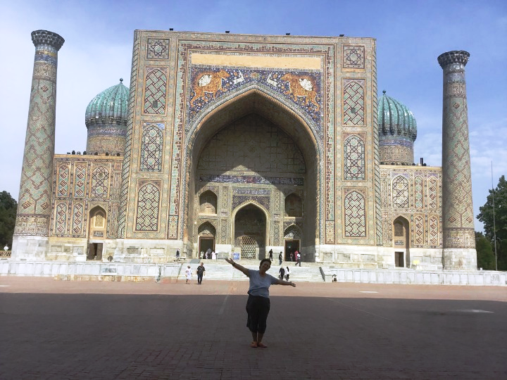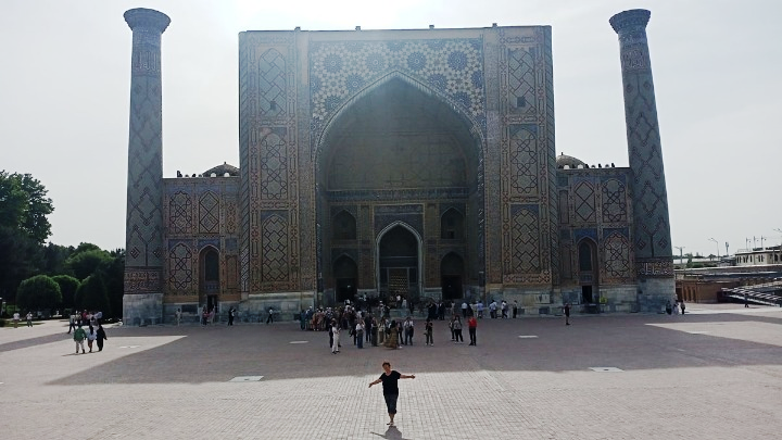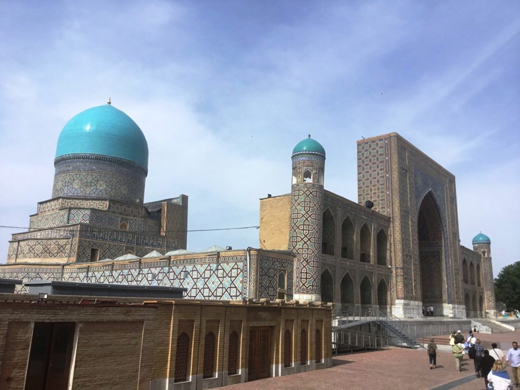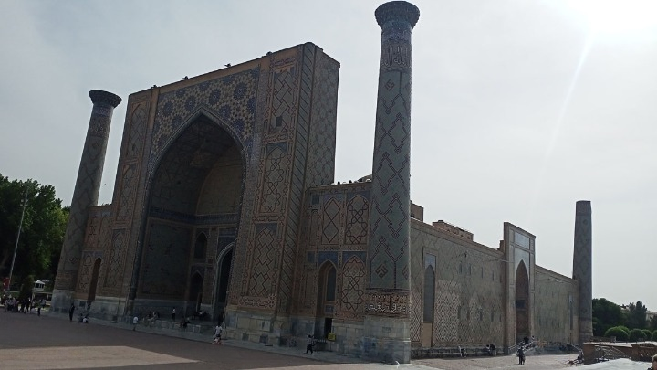 Semerkant’da ilk olarak kentin kalbi, merkezi ve simgesi olarak kabul edilen Registan Meydanı’na geliyoruz. Meydanın adı “kumlu yer” anlamına gelmektedir. Oldukça görkemli görünen meydanda üç medrese yer alıyor. Uluğ Bey Medresesi meydanda yapılan ilk medrese olup yapılış tarihi 1417. Uluğ Bey Medresesi’nin karşısında kapısındaki kaplan figürleri ile ünlü Sher-Dor (Şir Dor) Medresesi (yapım yılı 1636) yer alıyor. Ortadaki medrese ise “altın kaplama” anlamına gelen Tilla Kori (yapım yılı 1660) .