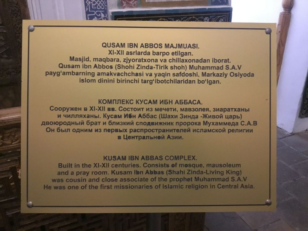 “Yaşayan Kral’ın Mezarı” anlamına gelen Şah-ı Zinde, Hz. Muhammed’in kuzeni olan ve 7. yy’da Semerkant’a İslam’ı yaymak üzere gelen Kusam ibn Abbas’ın sembolik mezarının etrafındaki odalardan oluşan bir kompleks. Kompleks ile ilgili söylenen birkaç efsane vardır. En yaygın efsanelerden birine göre Hz. Muhammed’in kuzeni olan Kusam ibn Abbas 676 yılında Zerdüşt Soğdiana’yı İslam’a döndürmek için buraya gelir. Ancak namaz kılarken kafirlerin saldırısına uğrayarak başı kesilir. Kendi kopmuş başını ellerinin arasına alarak yeraltı bahçesine götüren karanlık bir kuyuya atlamış ve bu güne kadar yaşamaya devam etmektedir. Diğer bir efsaneye göre ise mihraba Mekke’nin yönünü gösteren niş saklanmıştır. Semerkant halkı her pazar ve perşembe gecesi onu ziyarete gelir, adak adayıp inek, koyun, dirhem ve dinar getirirler; tüm bunlar türbenin yararına kullanılır. Şah-ı Zinde, 14. yy’da Timur ve daha sonra Uluğ Bey’in ailelerini ve sevdiklerini Yaşayan Kral’ın yanına gömmesiyle bugünkü halini almaya başladı.