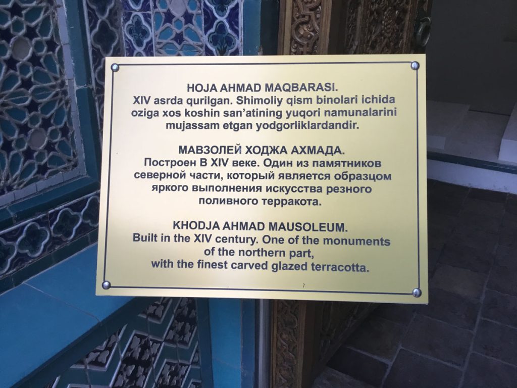 Şehir merkezine yaklaşık 20 km uzaklıkta ki türbenin kubbesi masmavi boya ile kaplanmış ve 62 parçadan oluşmaktadır. Türbenin bulunduğu alan restorasyonda olduğu için inşaat alanı görüntülenmeye açık değil. Yeniden ziyarete açılış tarihi Ekim-2025 olarak planlanıyormuş.