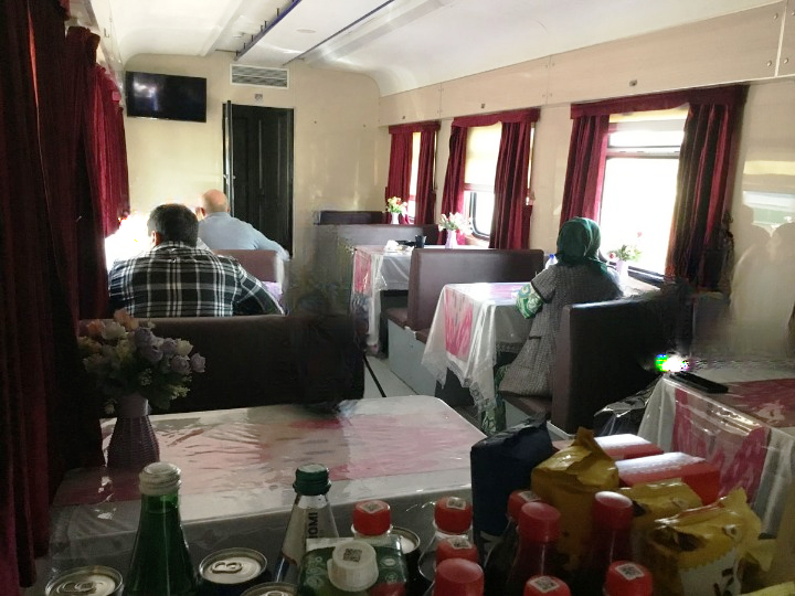 Trende pulman koltuklu vagonlarda seyahat edebilir, yemek vagonunda kısa süreli oturabilir ve bir şeyler atıştırabilirsiniz.