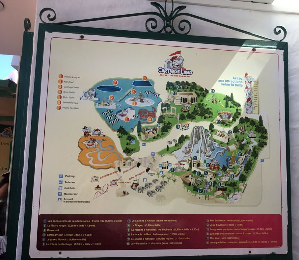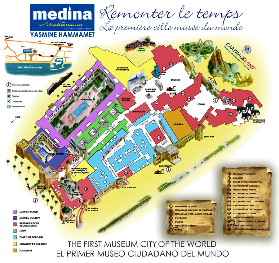 Medina içerisinde dükkanlar, dolambaçlı merdivenli sokaklardan geçerek eğlence parkının olduğu bölüme geliyoruz. Burada gideceğiniz yeri gösteren tabelalar mevcut. Sinema’dan King Kong’a, Carthage Land’e kadar nereye gidecekseniz rahatlıkla ulaşabilirsiniz. Aktivite merkezleri henüz saat erken olduğu için kapalıydı. Buralar daha geç saatlerde açılıyormuş.