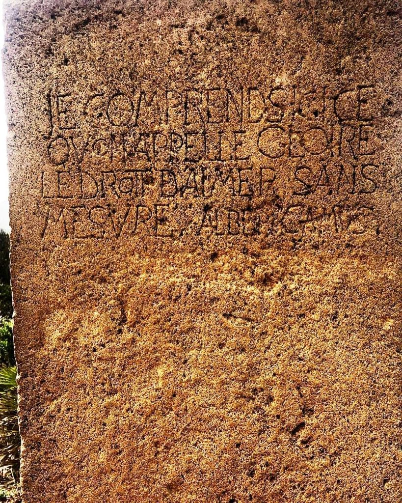 İşte bu stel 1961 yılında Albert Camus’un anısına, onun Noces à Tipas a adlı eserinden Fransızca olarak alınan şu ifadeyle dikilmiştir: “Burada, şan şöhretin ne olduğunu anlıyorum: sınırsız sevme hakkı.” (“Je comprends ici ce qu’on appelle gloire : le droit d’aimer sans mesure.”)