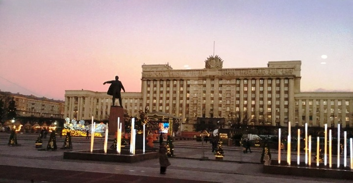 Otobüs ile panoramik olarak ilerlediğimiz Moskovskaya Caddesinde kafamızı sağa döndürdüğümüzde çok görkemli bir yapı görüyoruz. Meydandaki bu yapı Sovyet Evi (House of Soviets).