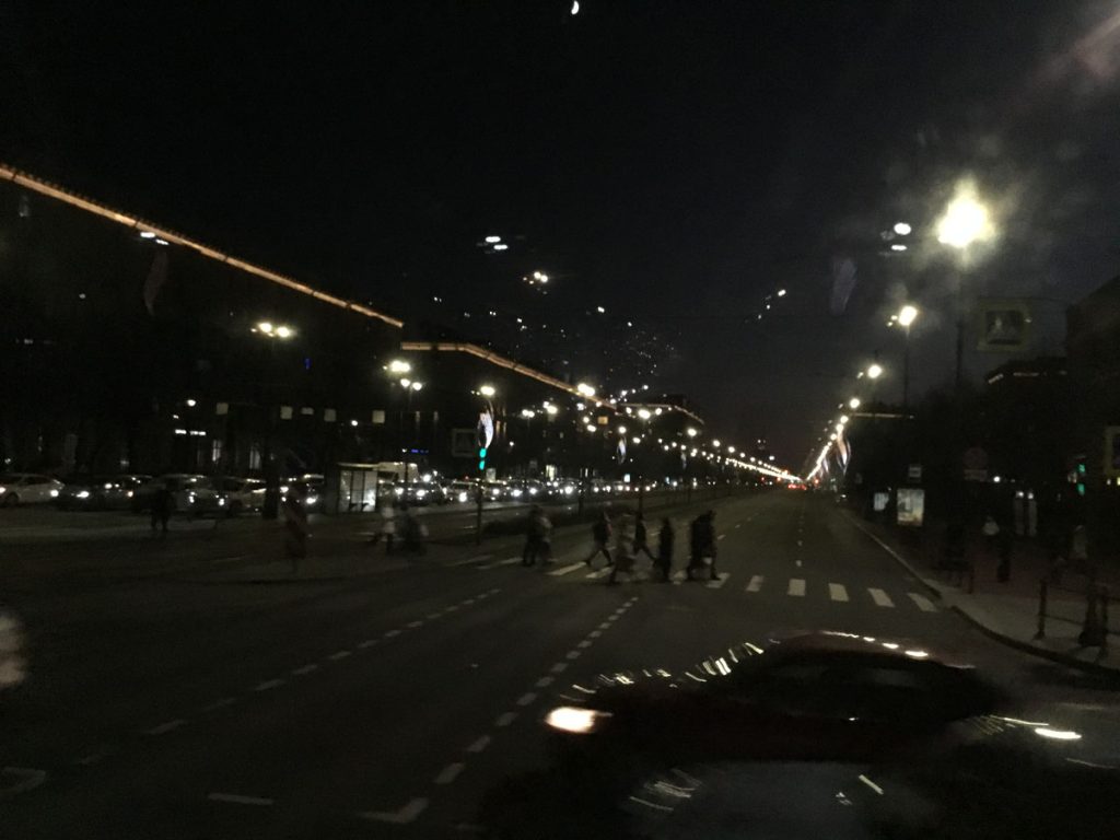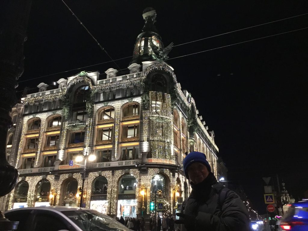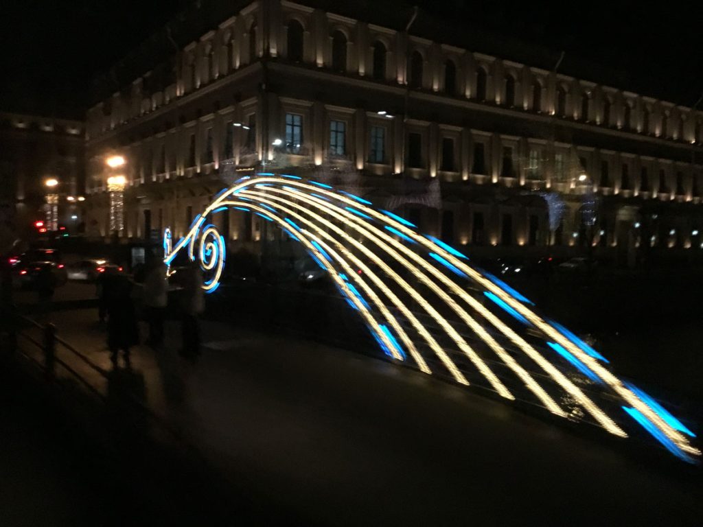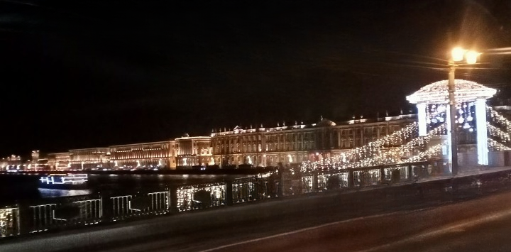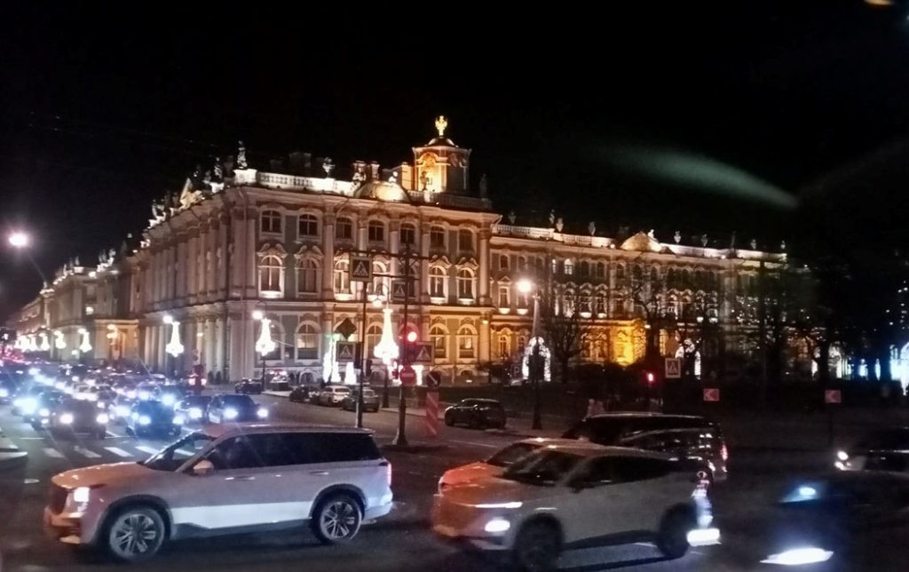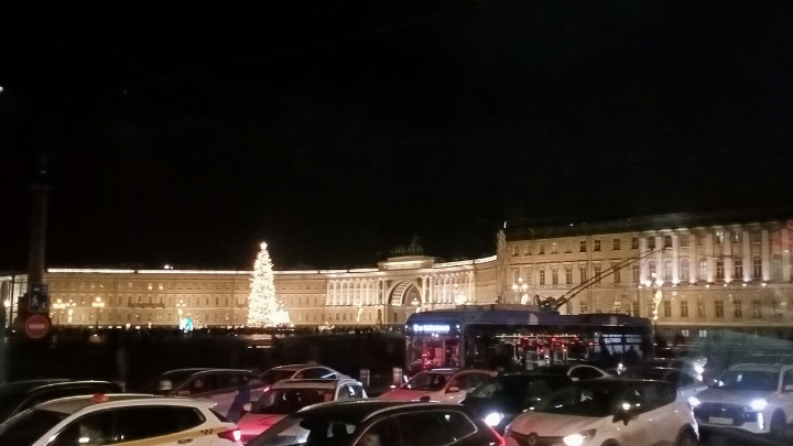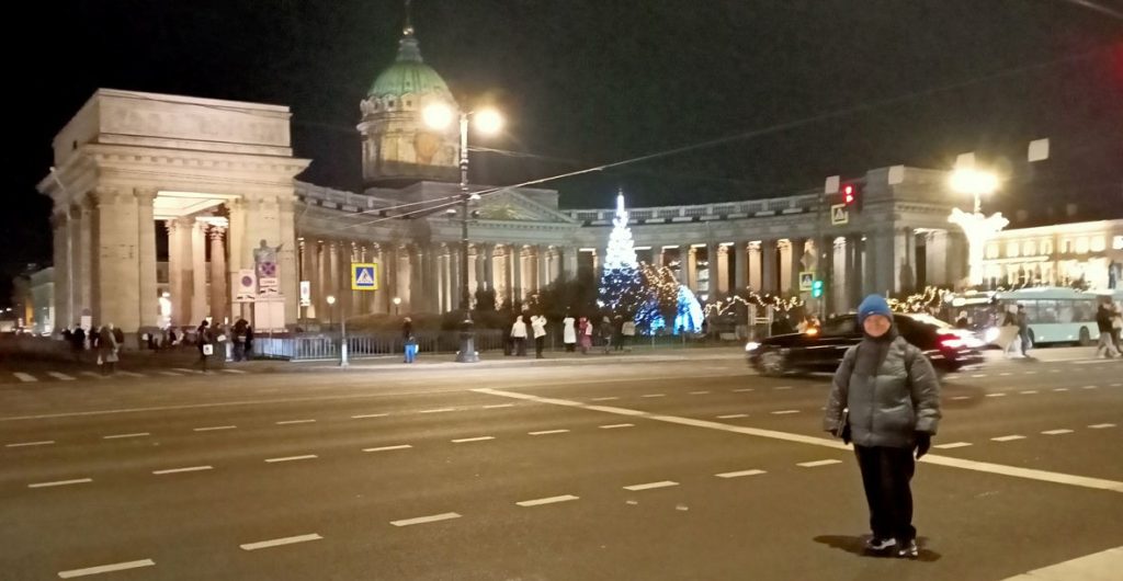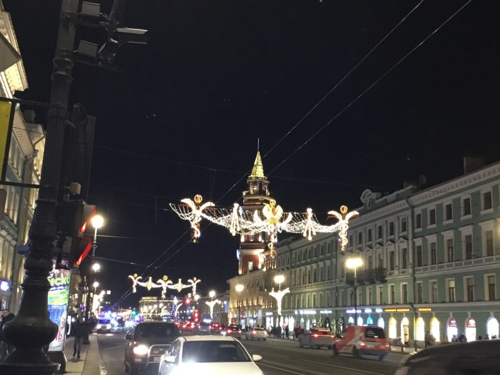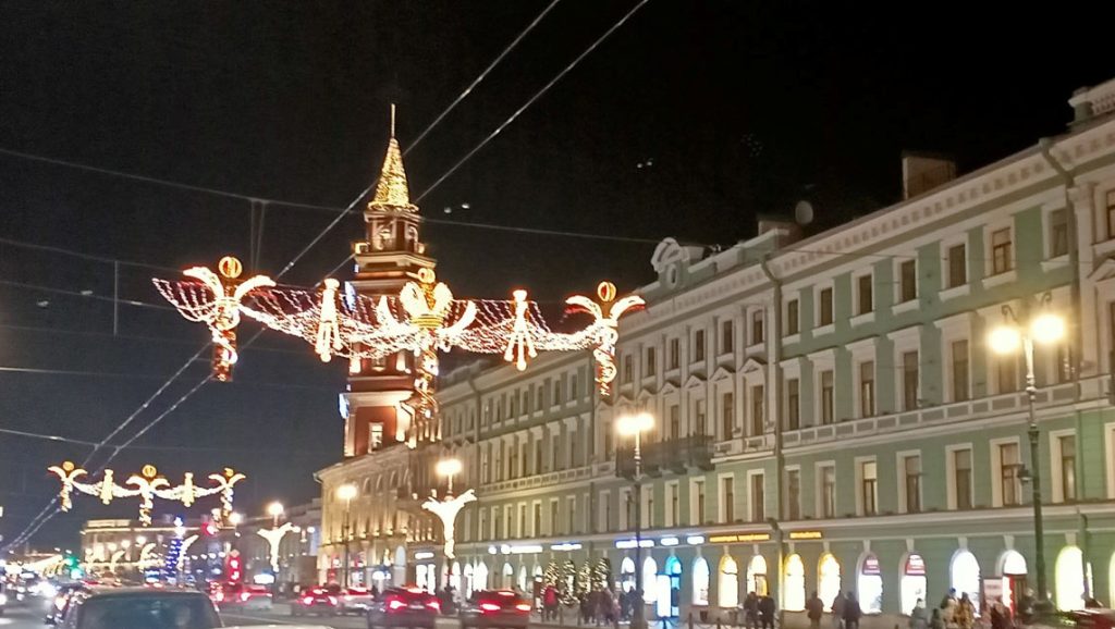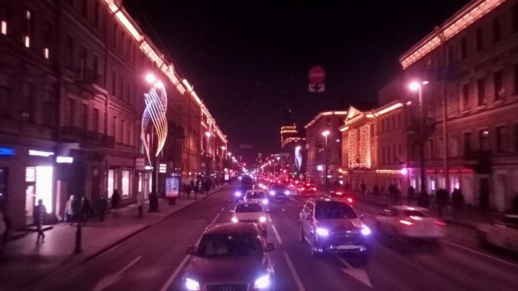 Para bozdurma işlemleri sonrası St. Petersburg’u panaromik olarak görüyoruz. Trafik ve para bozdurma işlemleri uzayınca şehirde hava karardı. Zaten bu mevsimde kuzeyde hava saat 15.00’de sonra kararıyor. Sabah saat 10.00’dan önce ağarmıyor. Otele gitmeden önce akşam karanlığında görebildiğimiz yerler biraz kısıtlı oldu. Neyse ki St. Petersburg’a daha önce üç kez geldiğimiz için bizim açımızdan çok sorun olmadı. St. Petersburg’da gündüz gördüğümüz yerler ile ilgili yazımız burada. Biz yılbaşı öncesi buraya geldiğimiz için Noel hazırlıkları yapılmış, her taraf ışıl ışıl göz alıcı.