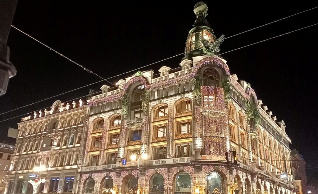St. Petersburg’un en büyük ve en ünlü kitapçısı Dom Knigi (Kitap Evi), Nevsky Prospekt üzerindeki yenilikçi ve zengin bir şekilde dekore edilmiş Art Nouveau şaheseri olan Singer Şirketi Binası’nda yer almaktadır. Devrimden önce Singer şirketi dikiş makineleri satıyordu ve 1938’den beri şehrin ana kitapçısı olarak hizmet veriyor. Cam kubbesi hayranlık uyandırıyor.