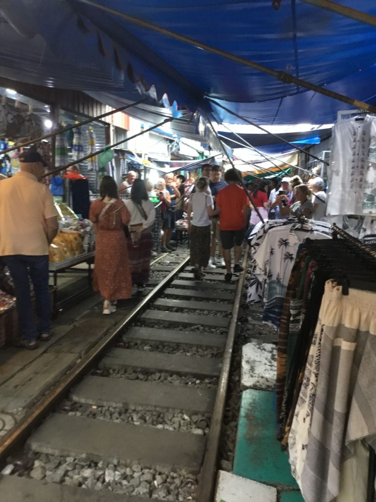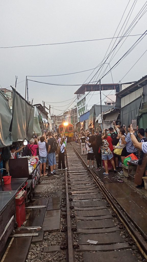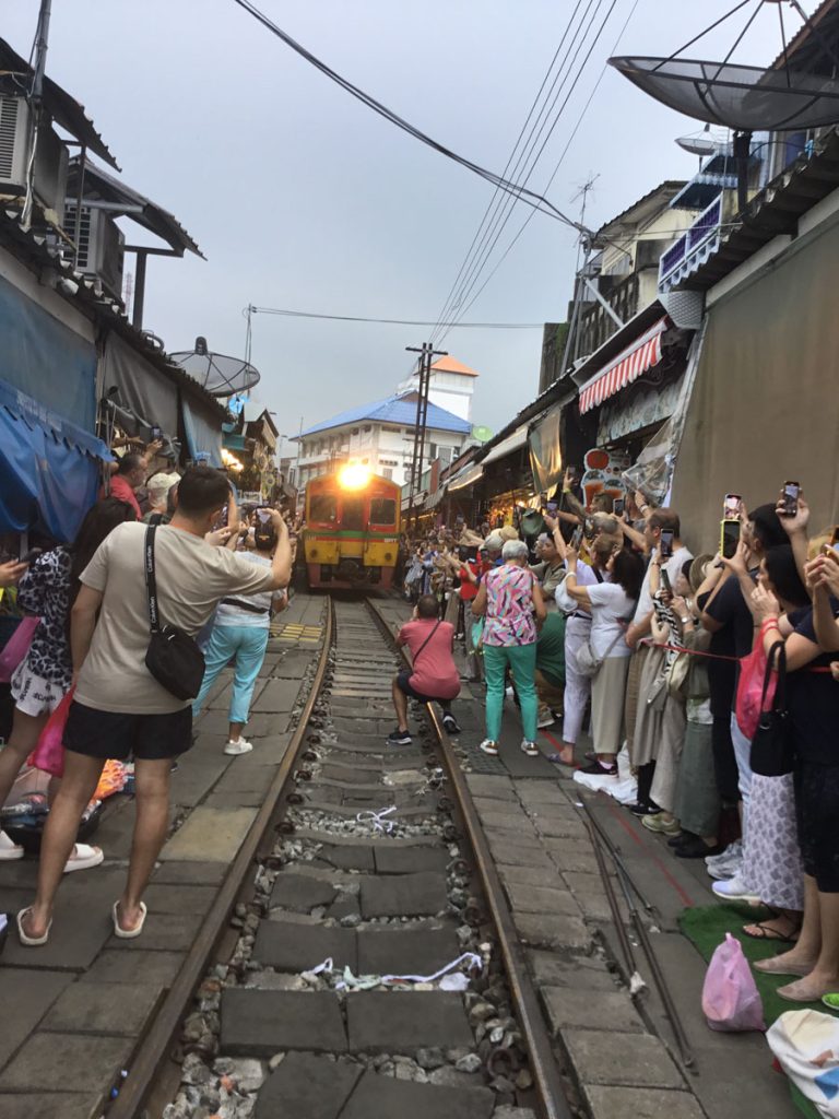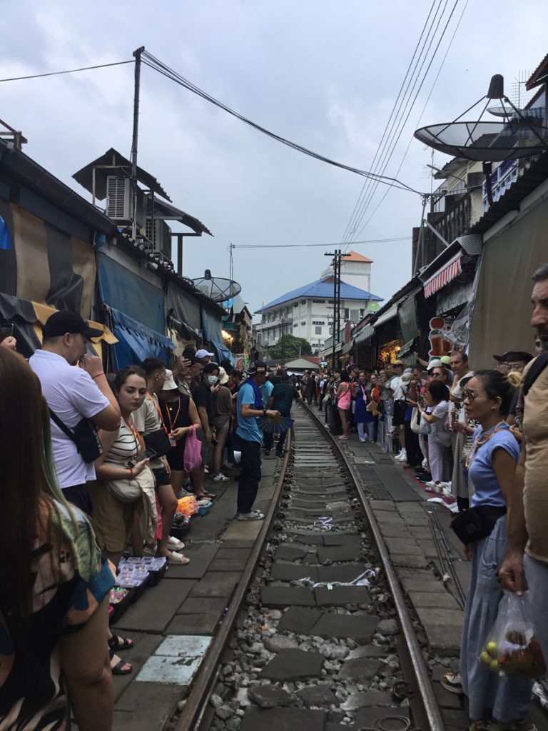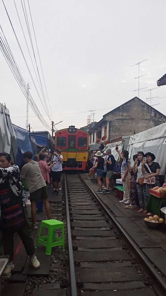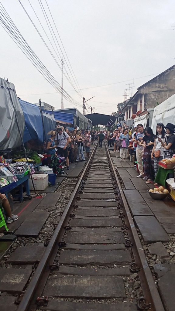 Bangkok’a gelmeden ününü çok duyduğumuz bu pazar Bangkok’a yaklaşık 80 km uzaklıkta. Dünyanın en sıra dışı pazarlarından biri olarak bilinen pazarın en dikkat çekici özelliği, aktif bir tren hattının tam üstünde kurulmuş olması. Pazar, 1905 yılında kurulmuş ve o günden bu yana yerel halk için önemli bir ticaret merkezi. Bu pazar sunduğu ürünler bakımından diğer pazarlardan çok farklı değil ama onu farklı kılan konumu: pazar demiryolu raylarının üzerinde 100 m’den fazla bir alana yayılmakta.
