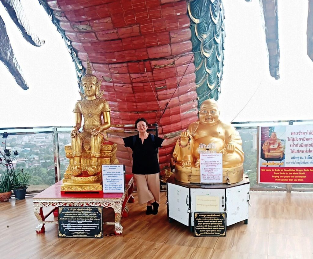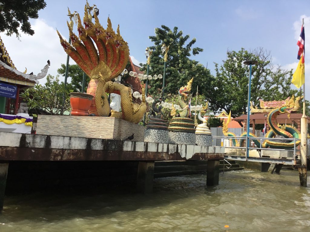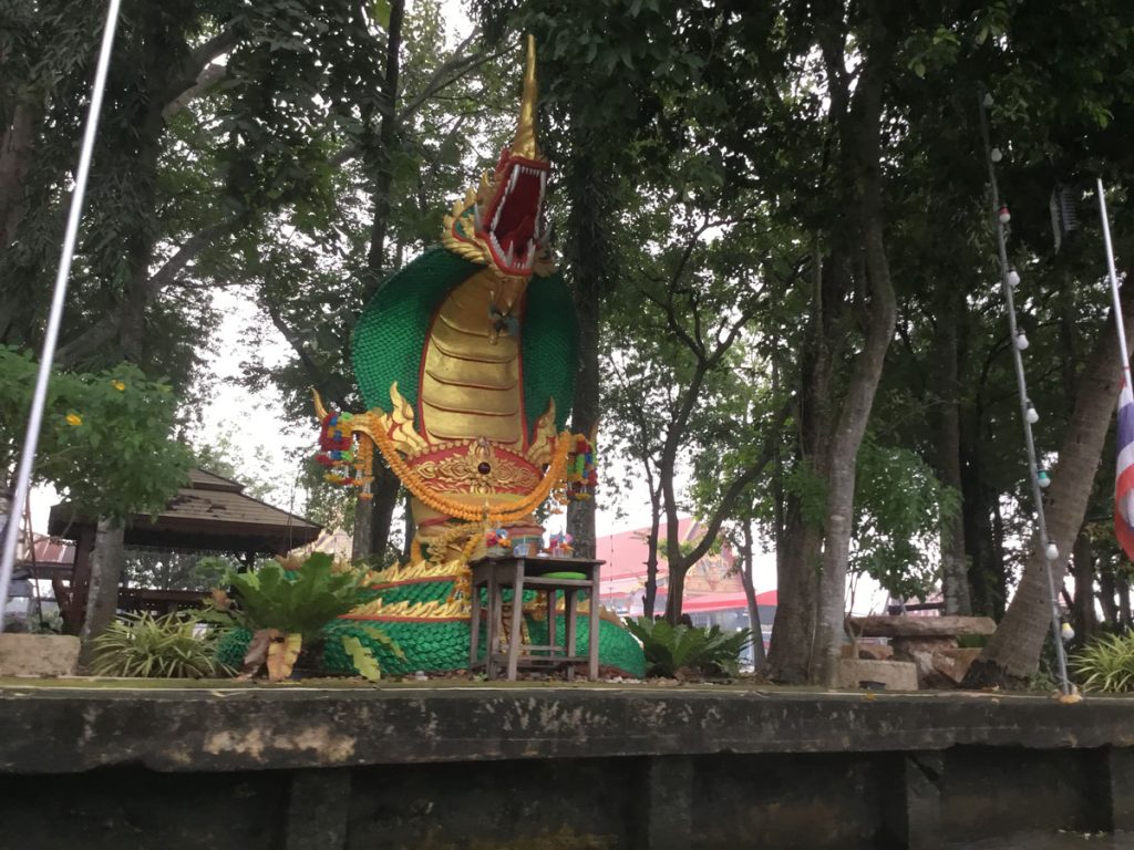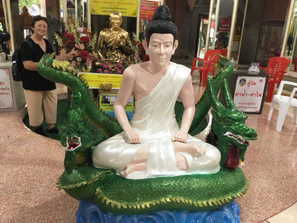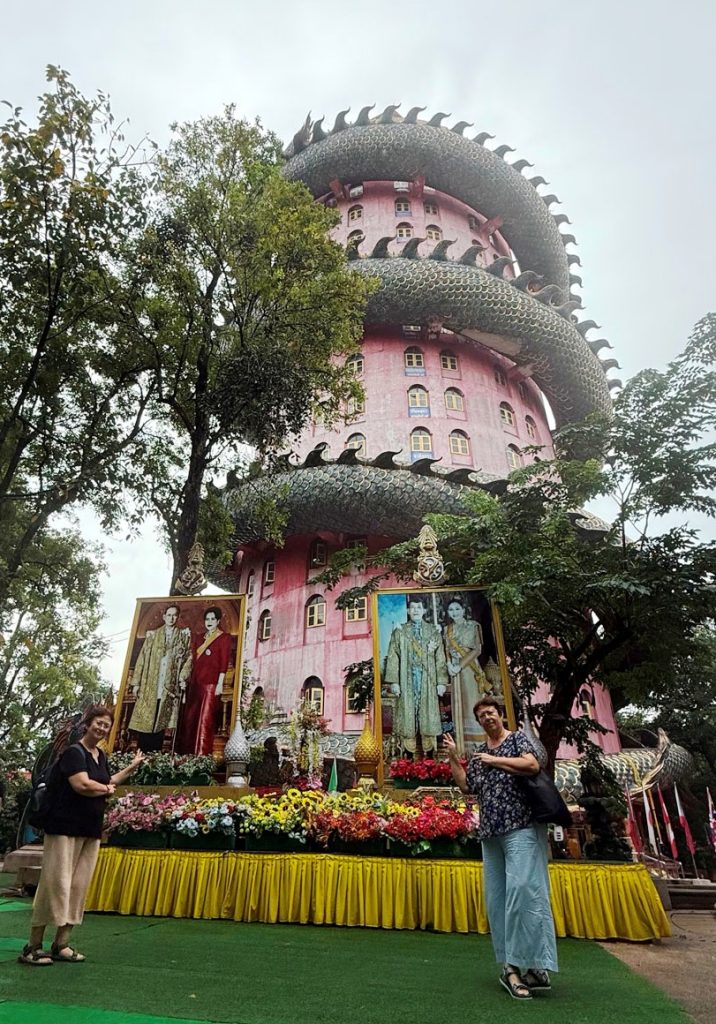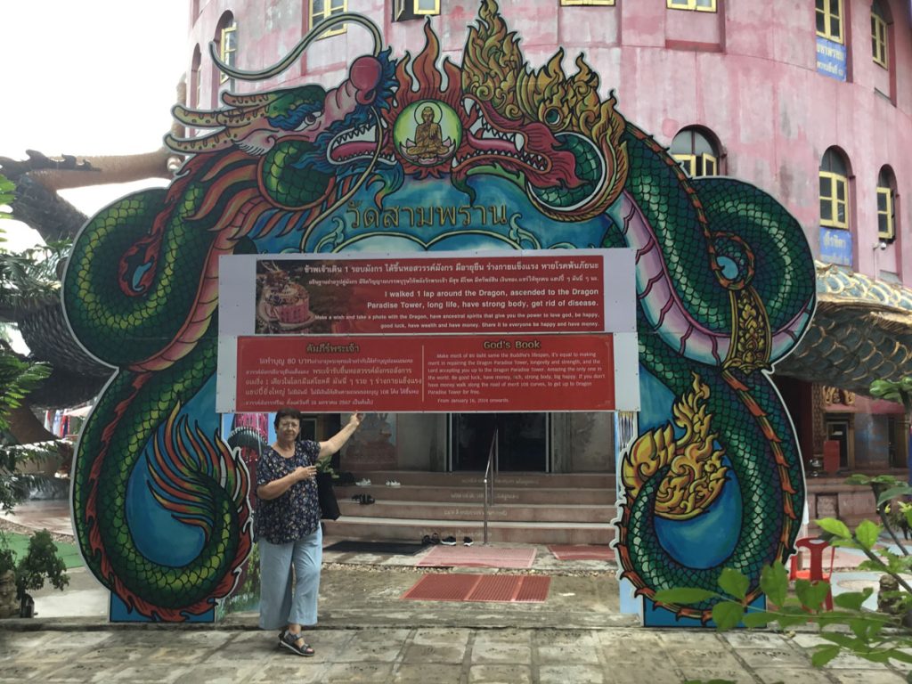 Dünya’da özellikle görüntüsü ile ünlü olan Bangkok’un yaklaşık 40 km uzağında olan bir tapınağa gidiyoruz. Çoğu zaman “Ejderha Tapınağı” olarak anılan tapınak, tüm yüksekliği boyunca kıvrılan devasa pembe ve yeşil bir ejderha heykeliyle çevrili. Tapınağa geldiğimizde gerçekten hayran olacağımız bir görüntü karşımızda. Ejderhanın parıldayan pulları, gözleri, çenesine kadar her detay ince ince işlenmiş.