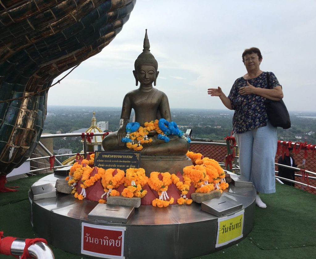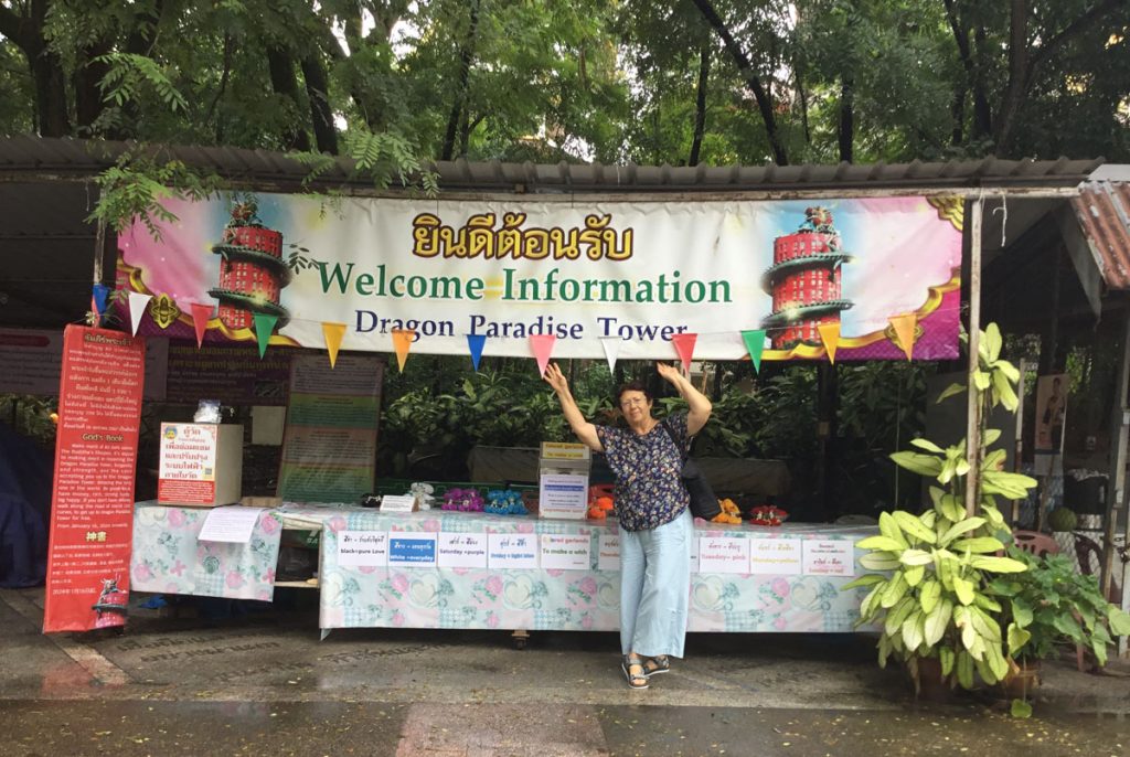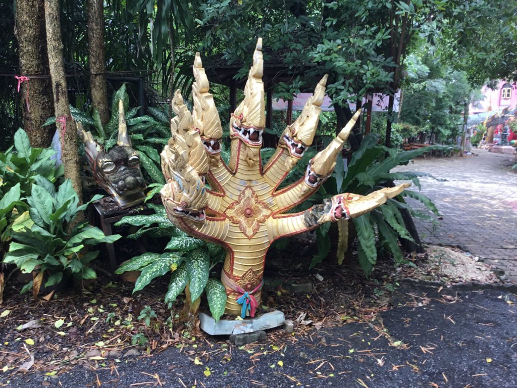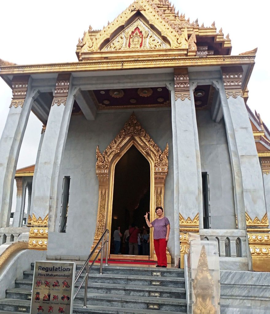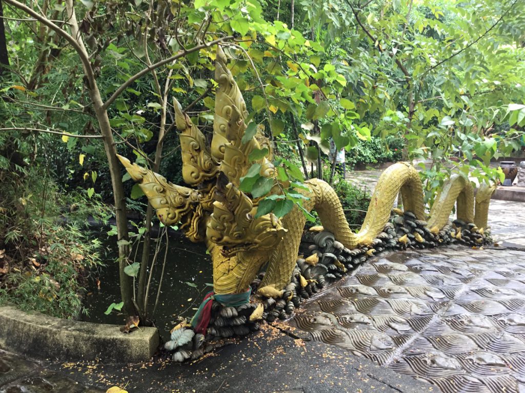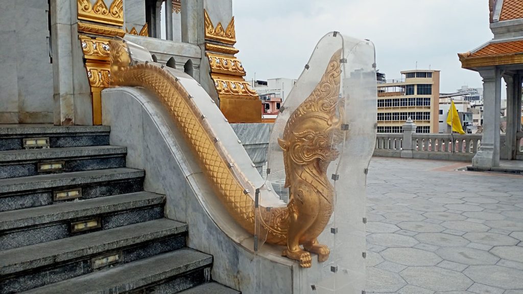 Dünya’da özellikle görüntüsü ile ünlü olan Bangkok’un yaklaşık 40 km uzağında olan bir tapınağa gidiyoruz. Çoğu zaman “Ejderha Tapınağı” olarak anılan tapınak, tüm yüksekliği boyunca kıvrılan devasa pembe ve yeşil bir ejderha heykeliyle çevrili. Tapınağa geldiğimizde gerçekten hayran olacağımız bir görüntü karşımızda. Ejderhanın parıldayan pulları, gözleri, çenesine kadar her detay ince ince işlenmiş.