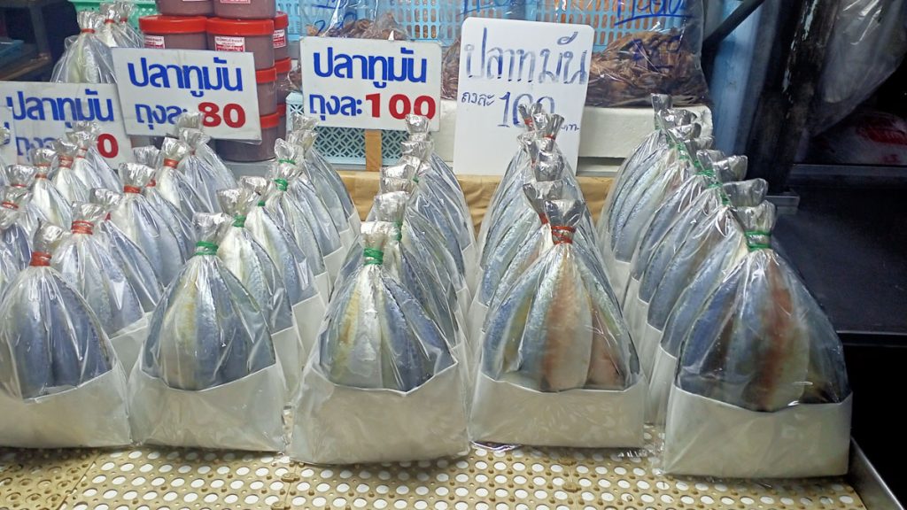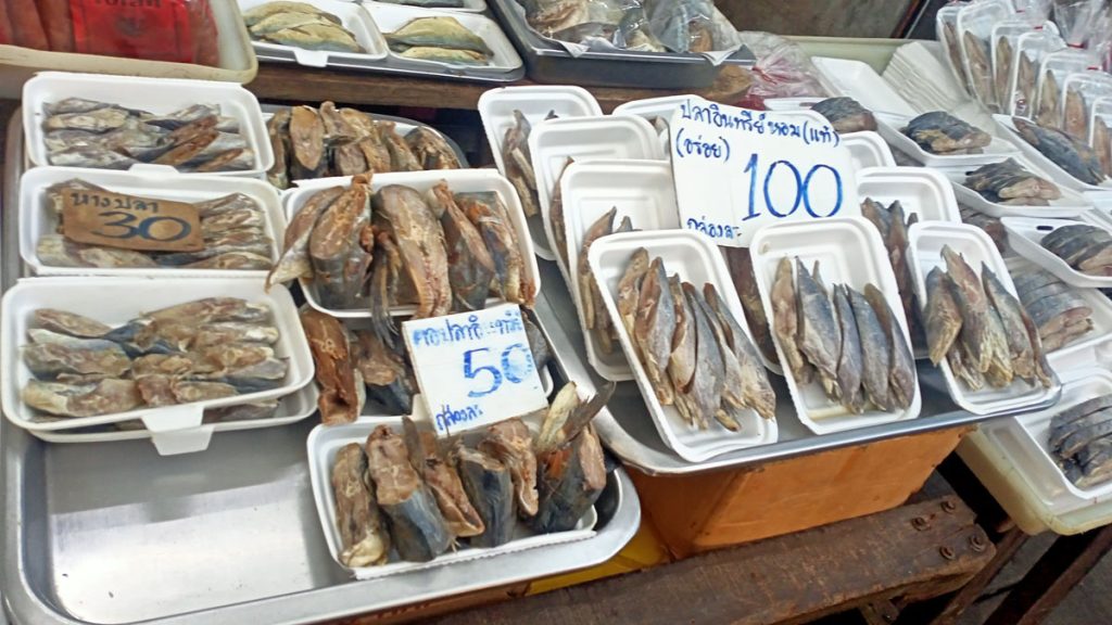 Bu pazarın bir diğer adı Talad Rom Hub (kapalı şemsiye anlamına geliyor) İlk kurulduğu zamanlar oldukça normal bir pazarmış. Ancak 1905 yılında pazarın tam ortasından geçen Mae Klong Demiryolu hattının inşa edilmesi burası için dönüm noktası olmuş. Pazar yerine geldik. Trenin gelmesine daha vakit var. Pazarı dolaşmaya başlıyoruz. Tezgahlarda taze deniz ürünleri, meyve, sebze ve baharatlar satılıyor. Çok çeşitli hediyelik eşyalar bulunuyor.