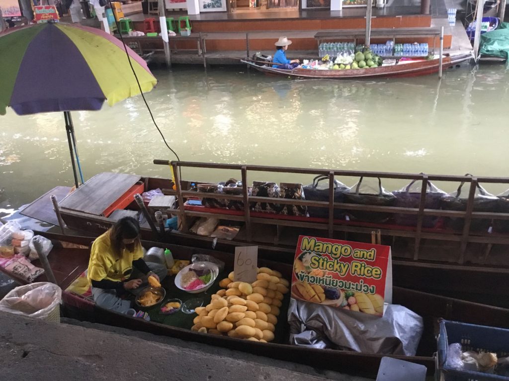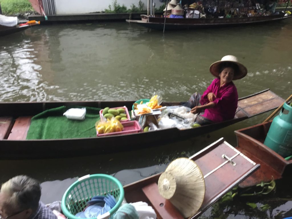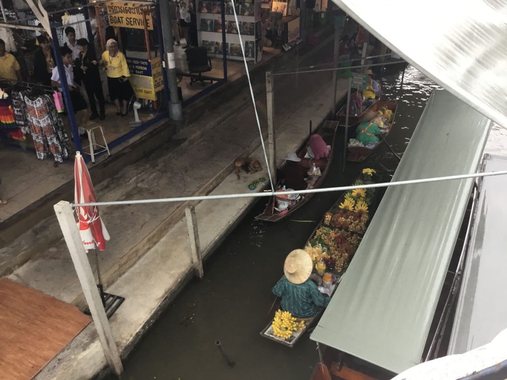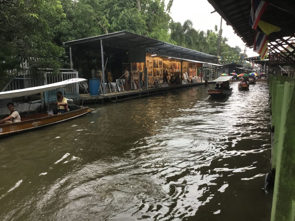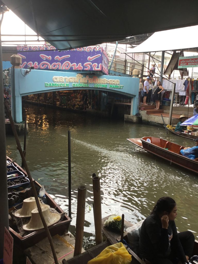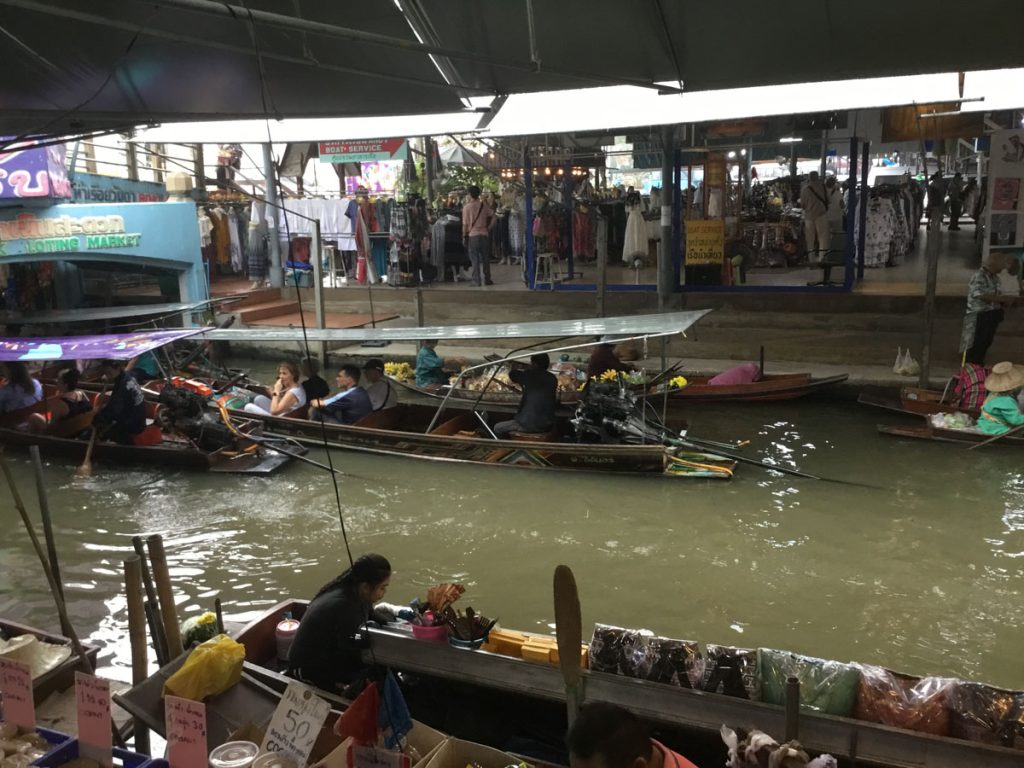Sonra çarşıyı dolaşmaya devam ettik. Kanal boyunca yüzen teknelerde satılan tropik meyveler, baharatlar, hediyelik eşyalar ve geleneksel Tay yemekleriyle buluşmak farklı bir deneyim. Tekneyle dar kanallarda gezinmek, geleneksel Tay evlerini, ahşap köprüleri ve kıyıda sebze meyve satan yerel halkı görmek çok heyecan verici. Ancak çarşı ününden dolayı çok aşırı kalabalık. Motorlu teknelerden kaynaklanan kirlilik, havayı nefes almaya zorlaştırıyor. Bir tavsiye bazen tekneler çok sıkışık duruma geliyor, ellerinizi tekne kenarlarında sakın tutmayın ve fotoğraf çekerken telefonlarınıza dikkat edin.