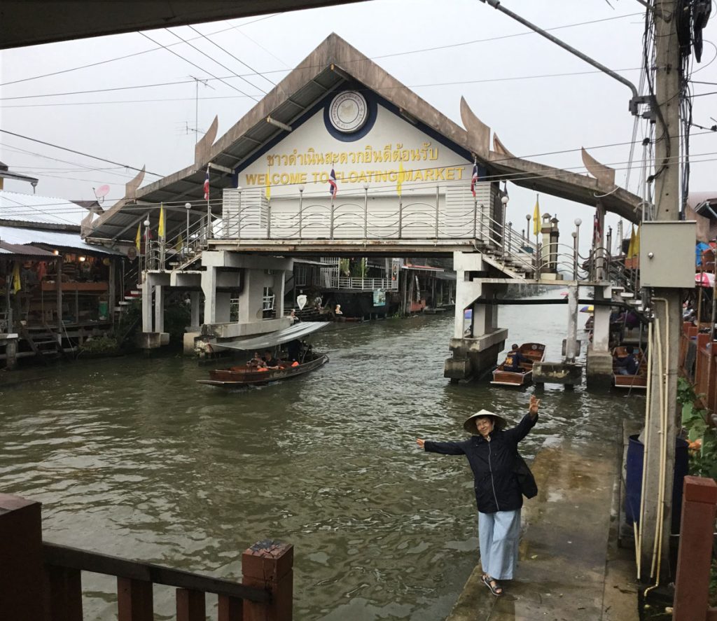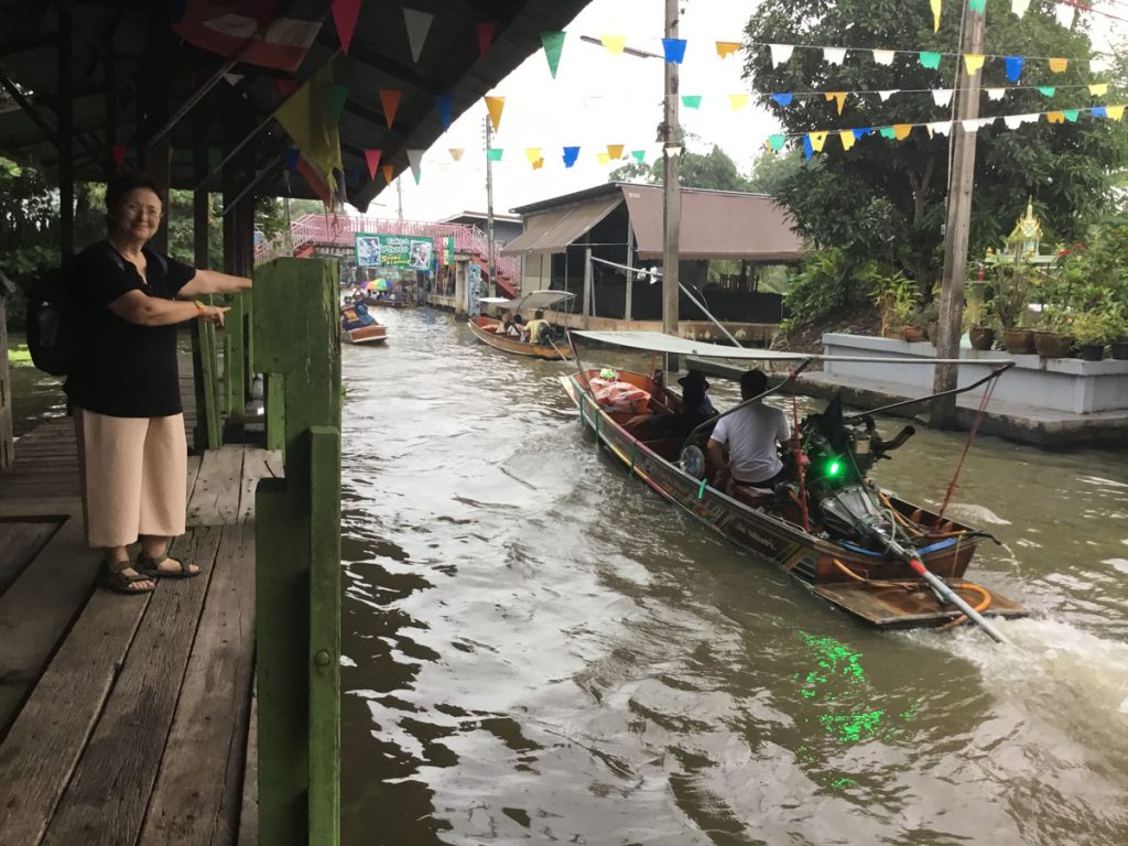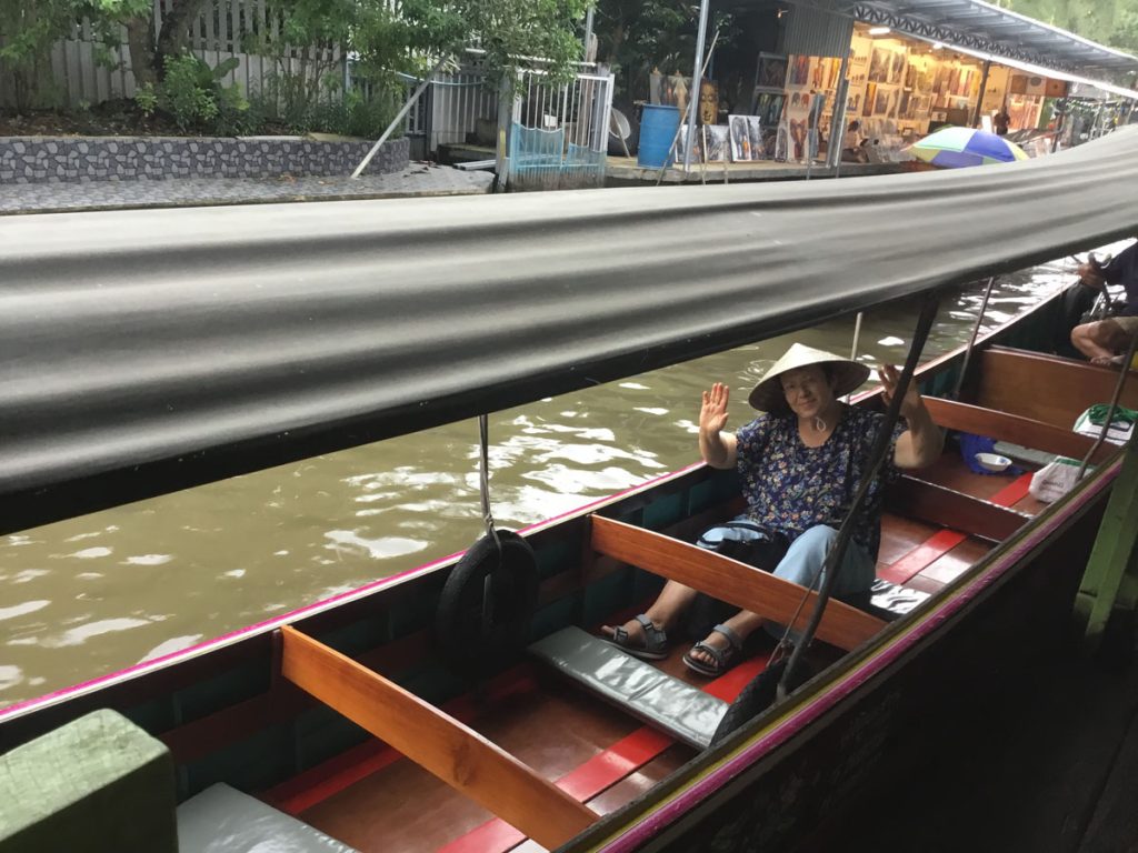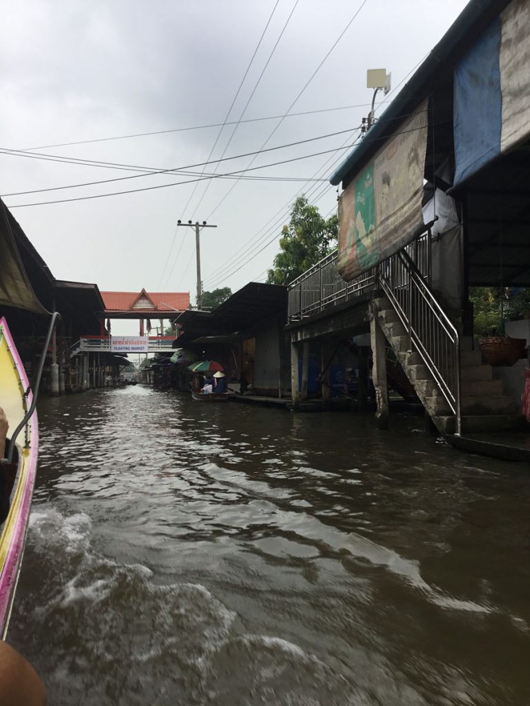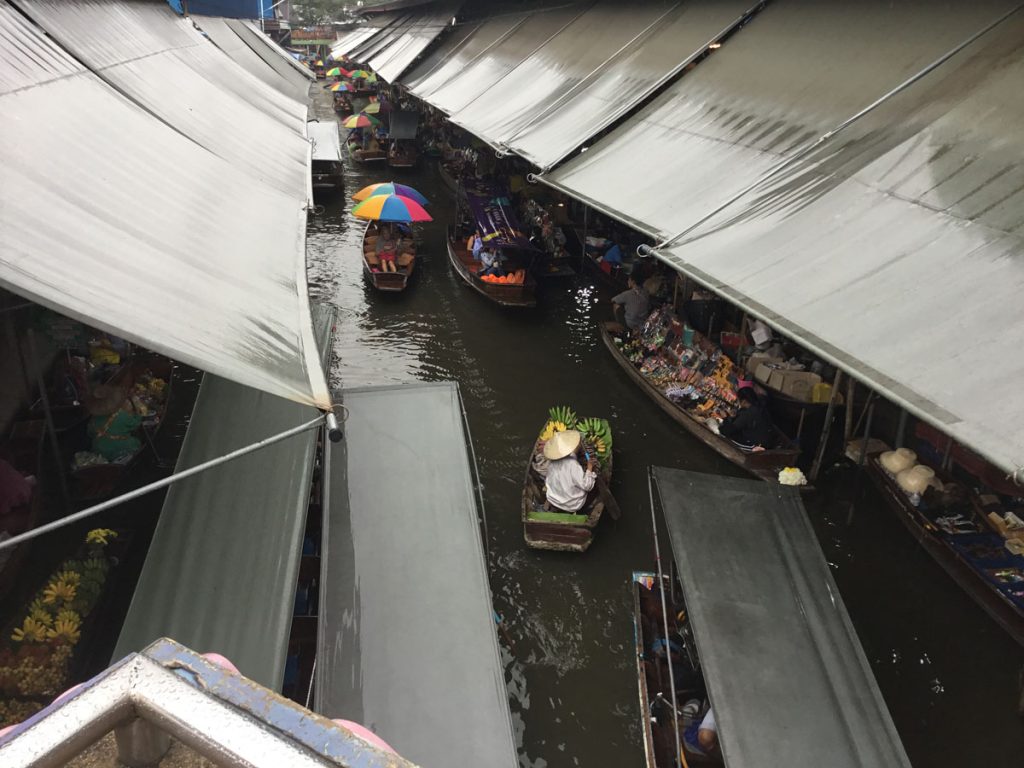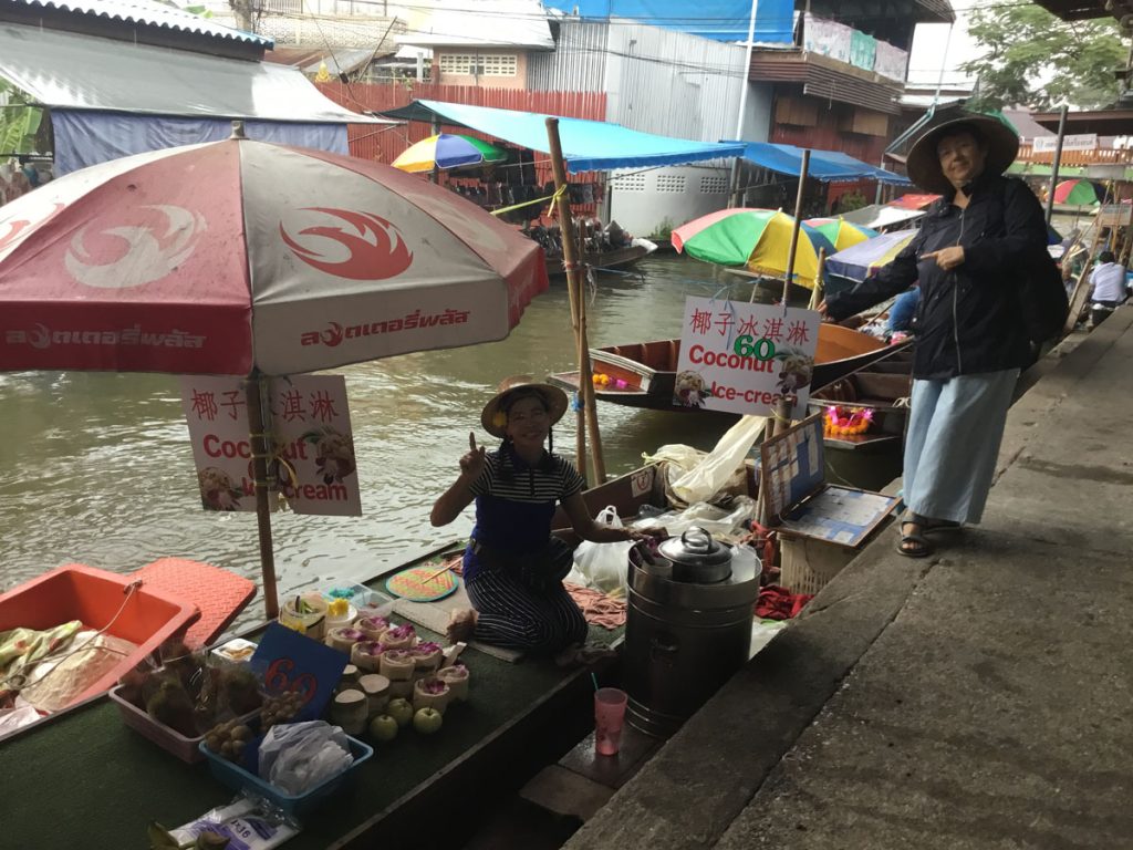 Sonra çarşıyı dolaşmaya devam ettik. Kanal boyunca yüzen teknelerde satılan tropik meyveler, baharatlar, hediyelik eşyalar ve geleneksel Tay yemekleriyle buluşmak farklı bir deneyim. Tekneyle dar kanallarda gezinmek, geleneksel Tay evlerini, ahşap köprüleri ve kıyıda sebze meyve satan yerel halkı görmek çok heyecan verici. Ancak çarşı ününden dolayı çok aşırı kalabalık. Motorlu teknelerden kaynaklanan kirlilik, havayı nefes almaya zorlaştırıyor. Bir tavsiye bazen tekneler çok sıkışık duruma geliyor, ellerinizi tekne kenarlarında sakın tutmayın ve fotoğraf çekerken telefonlarınıza dikkat edin.