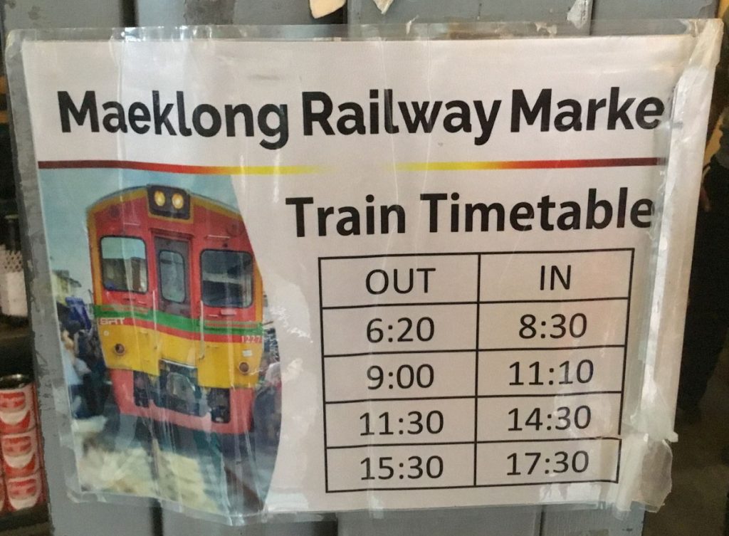 Mae Klong Pazarı sabah 7’den akşam 5’e kadar açık ama bizim amacınız tren geçişini görmek olduğu için trenlerin geçiş saatlerini bilmek gerekiyor. Trenlerin geçiş saatleri Bangkok tarafından gelen trenler: 08.30, 11.10, 14.30, 17.40/Mae Klong tarafından Bangkok’a giden trenler: 06.20, 09.00, 11.30, 15.30. Bu saatlere Bangkok’tan geliş mesafesini de hesaba katmanız gerekir. Biz saat 11.10 da geçecek treni görmek üzere hareket ediyoruz.