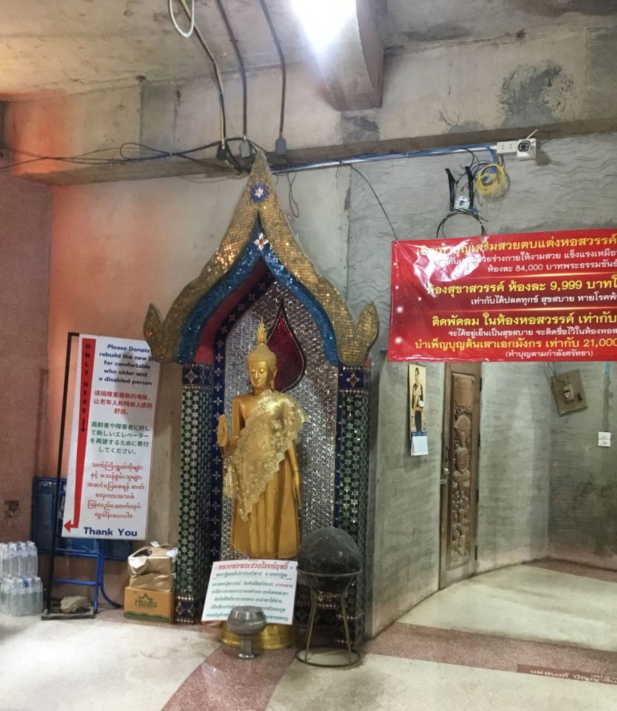 Heykelin ilginç bir hikayesi var. Birmanya istilasından korunmak için yüzyıllarca alçı ve sıva altında gizlenen heykel, 1955 yılında yerine taşınırken vinçten düşmüş ve sıvası çatlamış. O gece yağan yağmurun da etkisiyle alçılar soyulmuş ve altındaki saf altın ortaya çıkmıştır. Günümüzde dünyanın en büyük saf altın heykeli olarak kabul edilir.