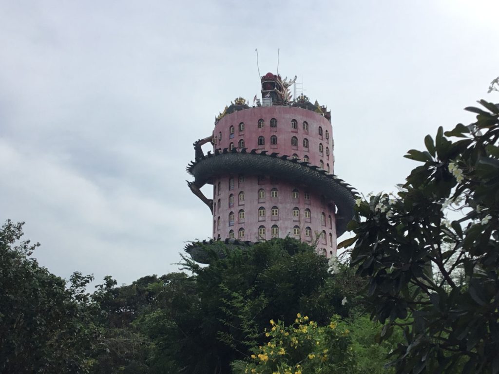 Bina olarak geleneksel tapınaklardan farklı olan yapı 17 katlı pembe silindirik binasıyla dikkat çekiyor. Ejderha figürünün içi boştur ve spiral şeklinde bir merdiven içerir. Tapınak Buda’nın 80 yaşında ölmesi nedeniyle 80 m yüksekliğindedir.