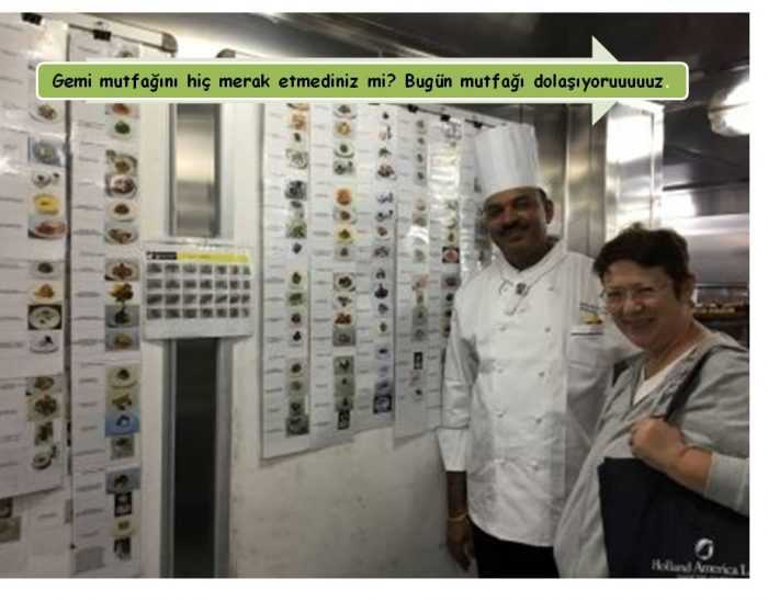 Bugün ikinci günümüz ve Filipinler-Manila’ya doğru yola çıktık. Tüm gün denizdeyiz. Odamıza bırakılan günlük aktivite haber bülteninden gemi mutfak turu olduğunu gördük. Eeee hemen…