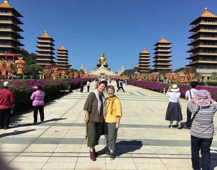 Kaohsiung Fo Guang Shan Buda Müzesindeyiz. Arkamızda bütün ihtişamı ile oturan Buda ve yanlarda 8 pagoda görülmekte. …
